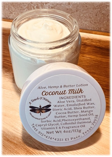 Discover the natural nourishment of Coconut Milk Handcrafted Lotion, expertly blended with aloe, hemp, and rich butters to hydrate and revitalize your skin. This lotion combines the soothing properties of aloe vera with the restorative benefits of hemp seed oil, delivering deep moisture without feeling greasy. The addition of nourishing butters ensures your skin stays soft, supple, and protected throughout the day.
